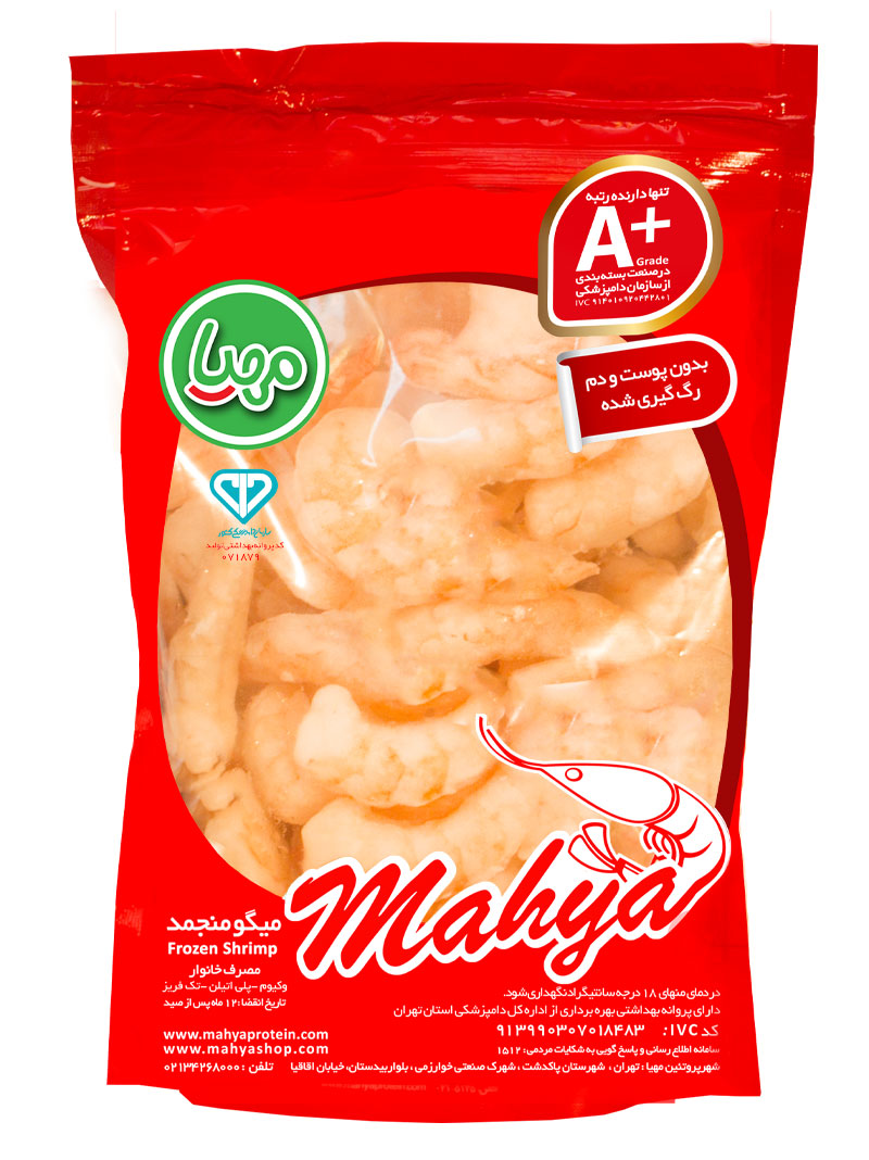 چیدمان: هر بسته از این محصول مهیا پروتئین حاوی 41 الی 50 عدد میگو بدون پوست و رگ گیری شده معادل 450 گرم می باشد.